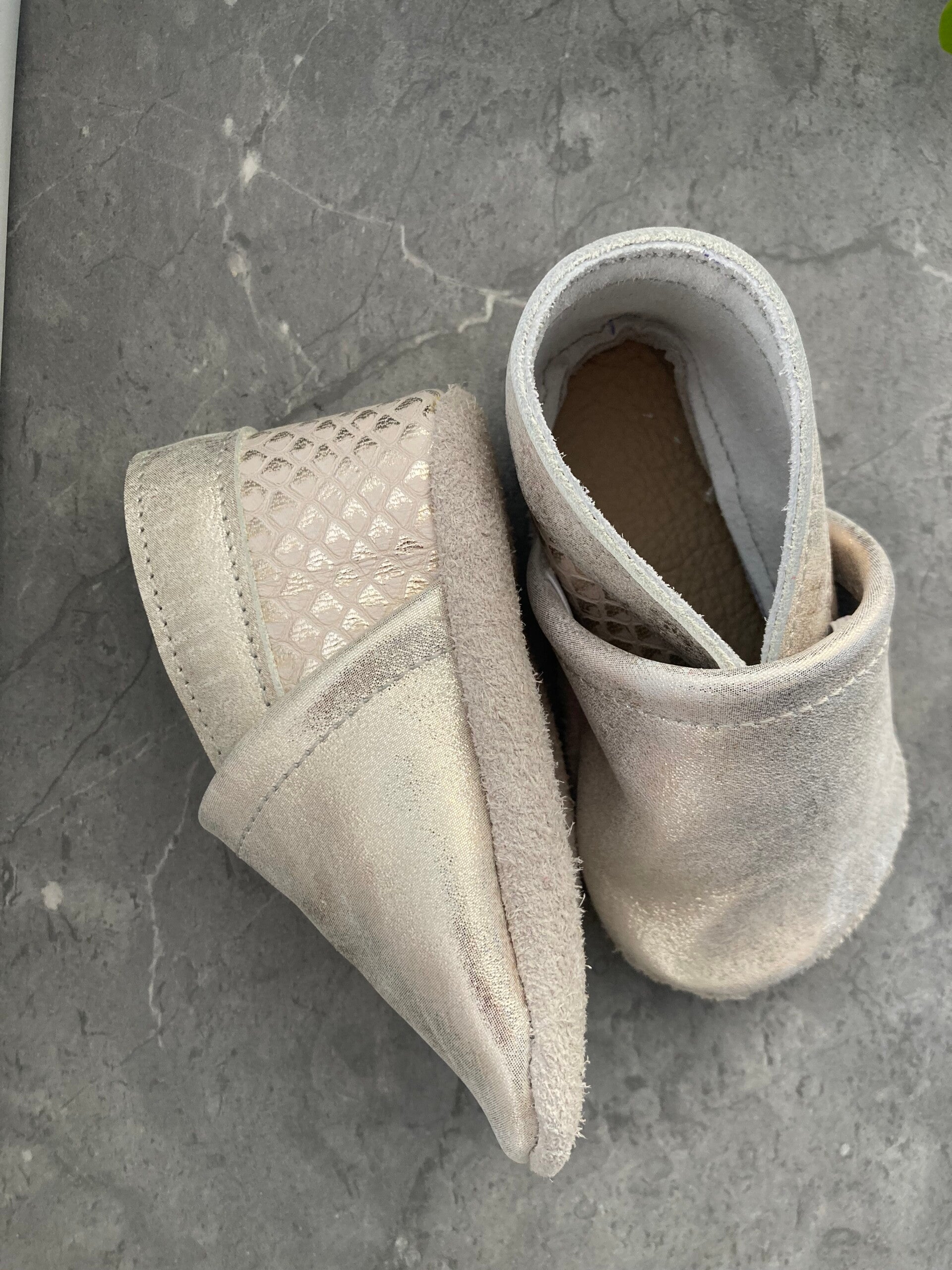 Dit paar leren slofjes is lichtgewicht, voorzien van anti slip zooltje en uitvallen van deze slofjes is onmogelijk. Het helpt je kindje de eerste stapjes zetten zonder uit te glijden. Ukkepuk blij, jij blij!