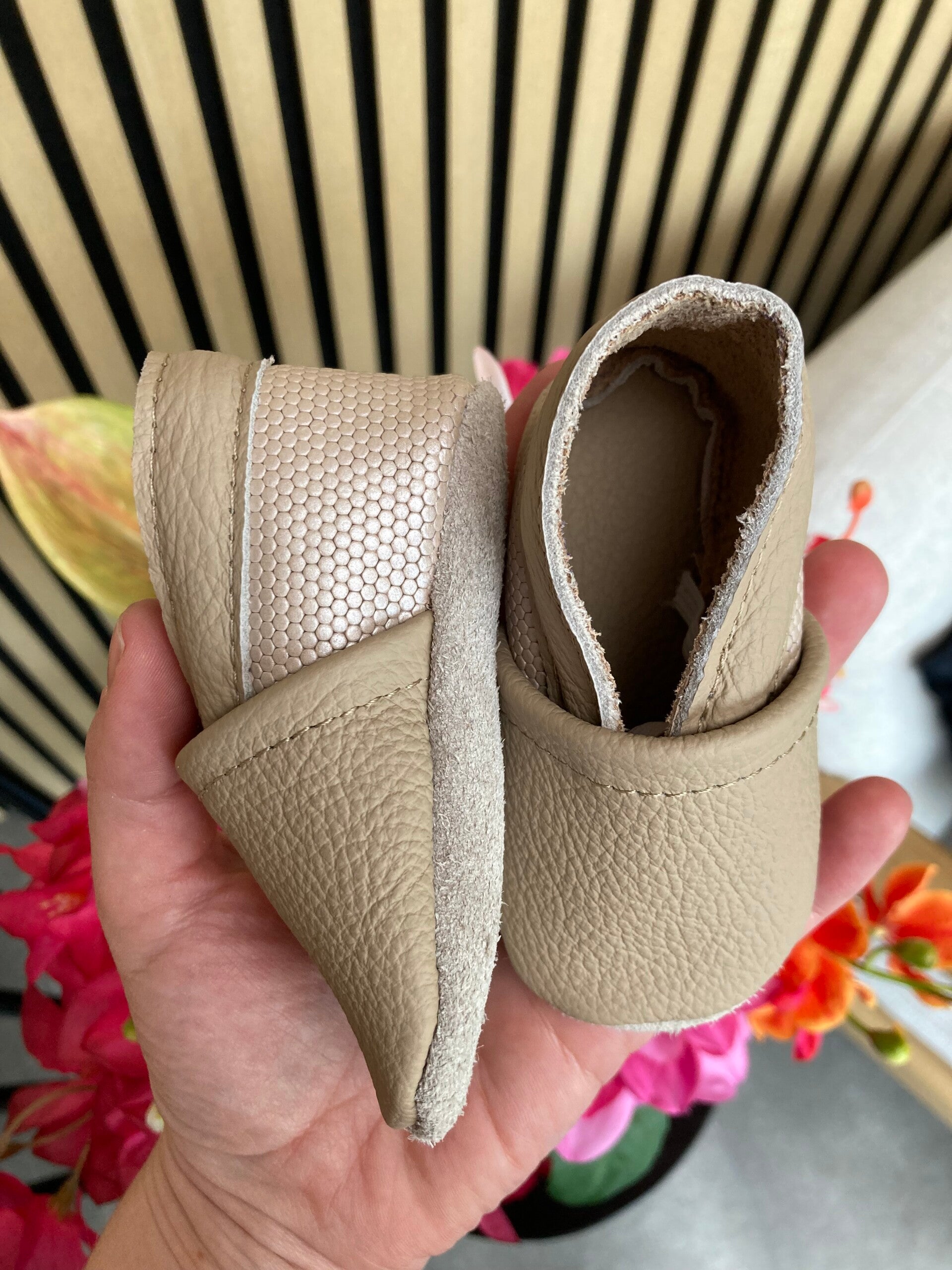 Dit paar leren slofjes is lichtgewicht, voorzien van anti slip zooltje en uitvallen van deze slofjes is onmogelijk. Het helpt je kindje de eerste stapjes zetten zonder uit te glijden. Ukkepuk blij, jij blij!
